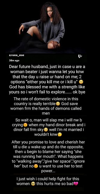 Fake Big Brother Naija housemate, Eriata Ese, who was evicted from the house a few weeks ago wrote a letter to her future husband, saying she would kill him if he batters her.