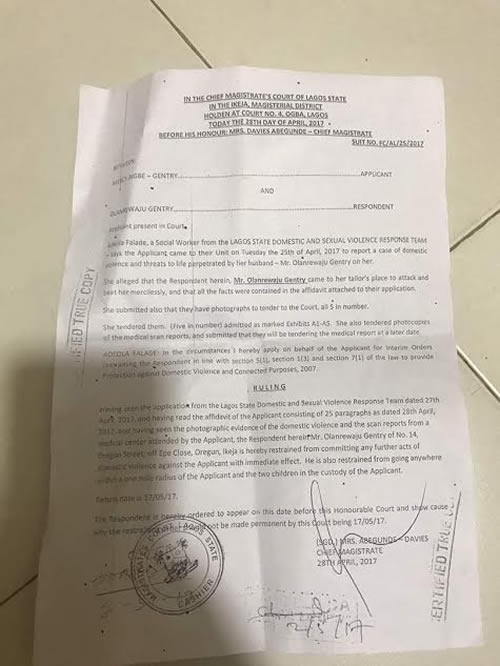 According to LIB, a restraining order with suit number: FC/AL/25/2017, issued by an Ikeja Magistrates’ court was obtained by the battered actress.